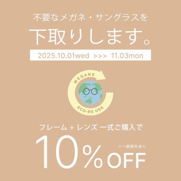 2025年10月1日(水)~11月3日(月・祝)の期間中、使わなくなったメガネ、サングラスをご持参で、フレーム+レンズ一式ご購入時に10%オフとなります。