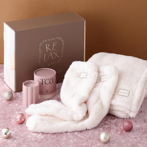 暖かく手触りの良いスロー(ひざ掛け)とルームソックス、紅茶の香りをイメージしたフレグランスキャンドルがセットになったギフトボックスです。