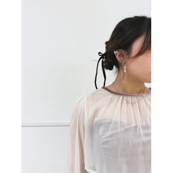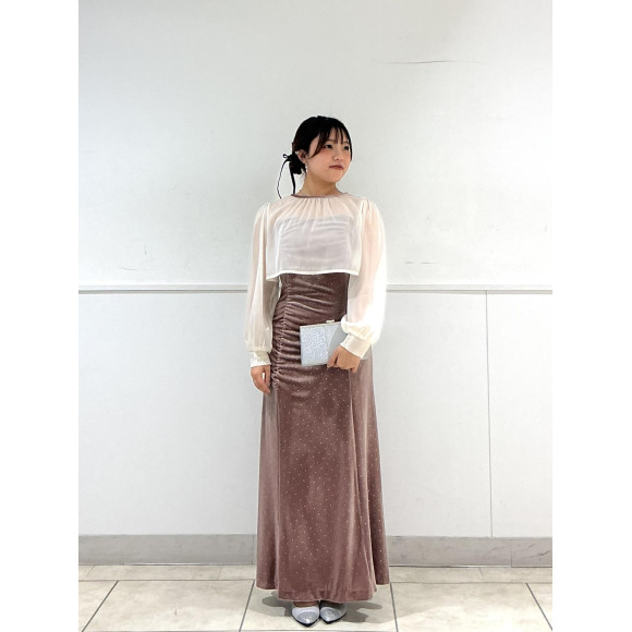 本日は“オーガンジーカフススリーブブラウス×箔ドットベロアギャザーデザインドレス2点セット”をご紹介いたします。