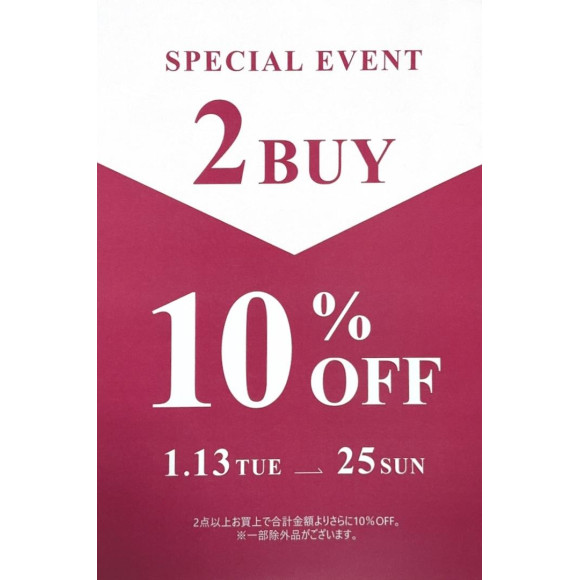 1/13(火)~1/25(日)の期間中、2点以上お買い上げいただくと10%OFFとなるキャンペーンを開催しております。