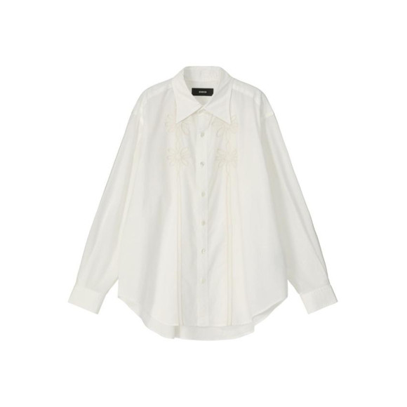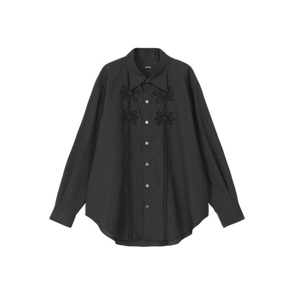 -直線的なシャツに柔らかさを添える、胸元の8枚花びら(ユイットペタル)の立体コード刺繍