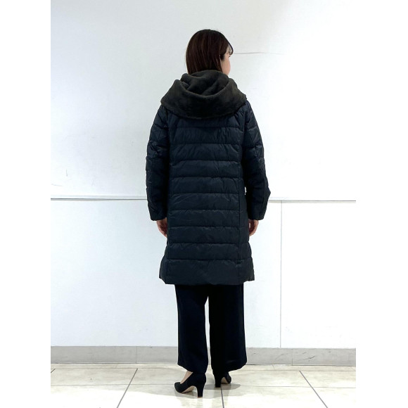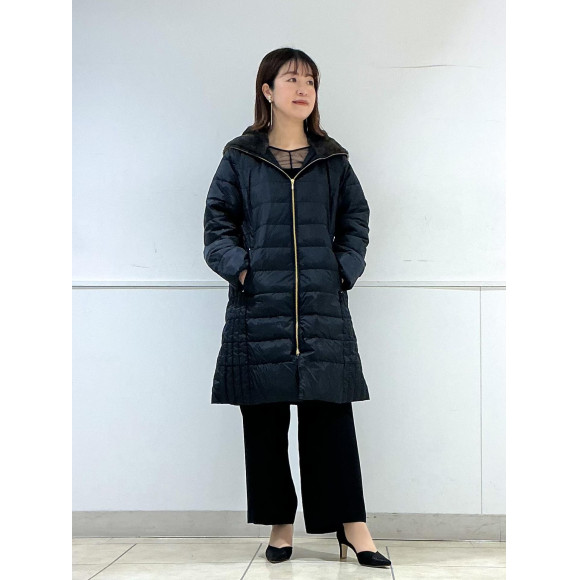 本日はフェイクファーフード付き撥水加工高密度タフタミドル丈ダウンをご紹介いたします。
