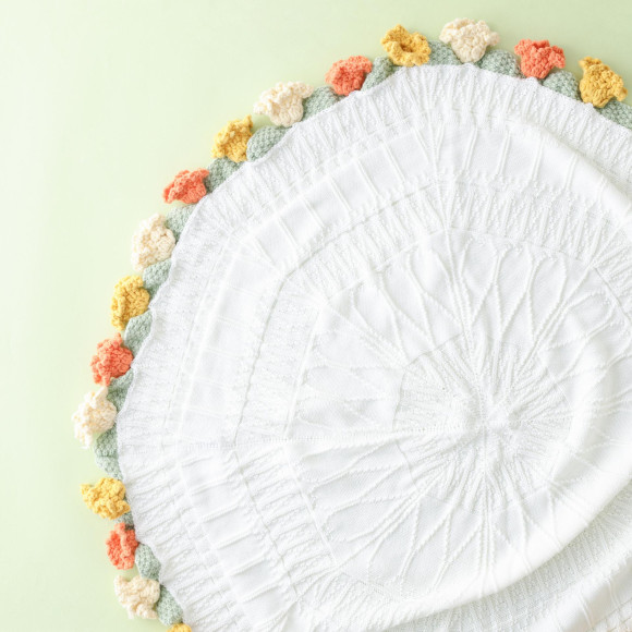 くるくると丸めると花束のようになる鍵編みスロー(ひざ掛け)です。