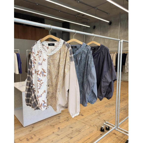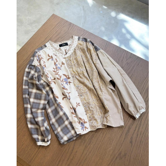 -ペイズリーや植物柄、チェックなどの異なるパターンを左右非対称に大胆に配置