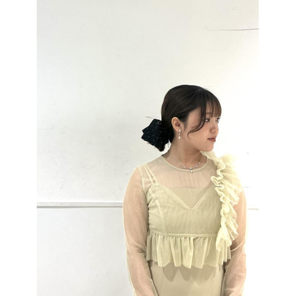 袖と胸元、ビスチェを同素材のソフトなラメチュールにすることで華やかさと抜け感が楽しめます♪